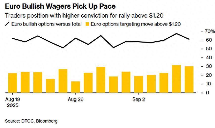在周二欧盘交易时间段,欧元兑美元上涨0.1%至1.1780美元,一举创下7月24日以来最高点,随后在周四欧洲央行决议前稍微回吐涨幅。期权市场可谓强化了这一走势,所谓的“风险逆转”指标在各期限上显示强烈的看涨情绪。来自美国存托信托与清算公司(DTCC)的统计数据显示,自上周五以来的看涨期权押注中有三分之一的目标是突破1.20美元关口。市场对于欧元兑美元趋势的最新举动与预判可谓进一步强化了所谓的“美元长期熊市逻辑”。