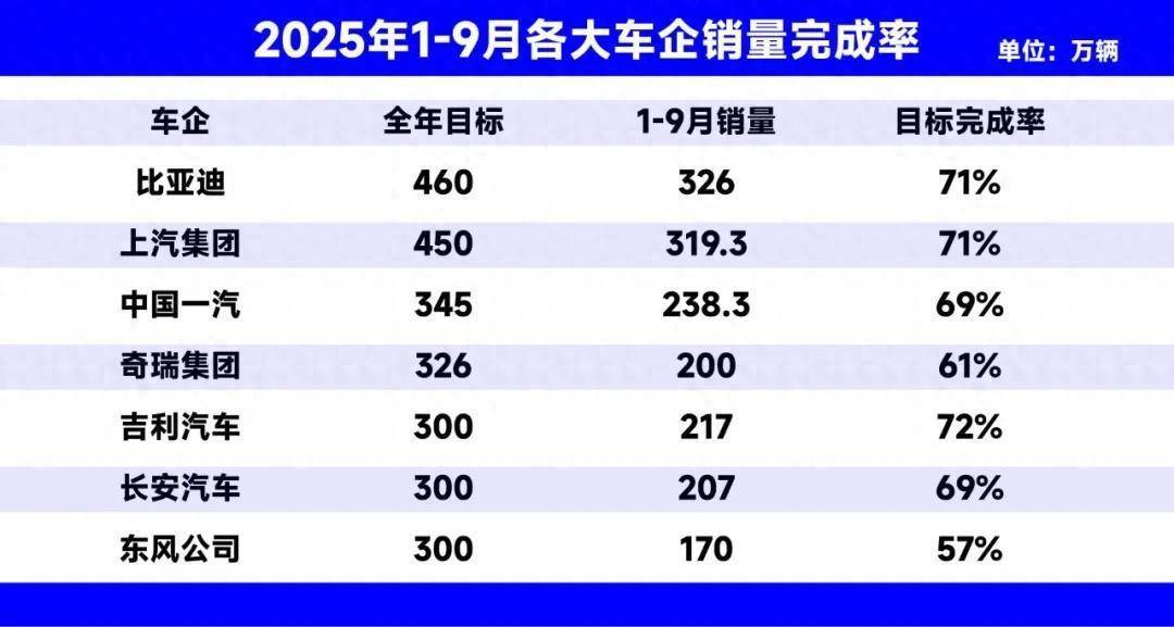 在众多车企中,比亚迪、吉利、上汽这三家“种子”选手表现出色,其目标达成率均超过了70%。其中吉利汽车完成率高达72%,吉利9月销量达到27.31万辆,创下历史新高,也推动1-9月累计销量达到217万辆,已超过2024年全年。按照吉利汽车目前的发展势头,今年完成300万辆的销量大计指日可待。