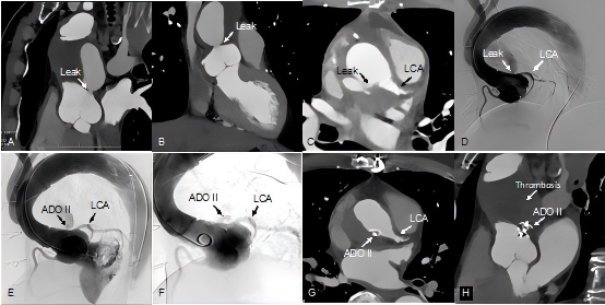 图G:术后1个月复查主动脉CTA,提示封堵器位置良好,LCA显影良好;