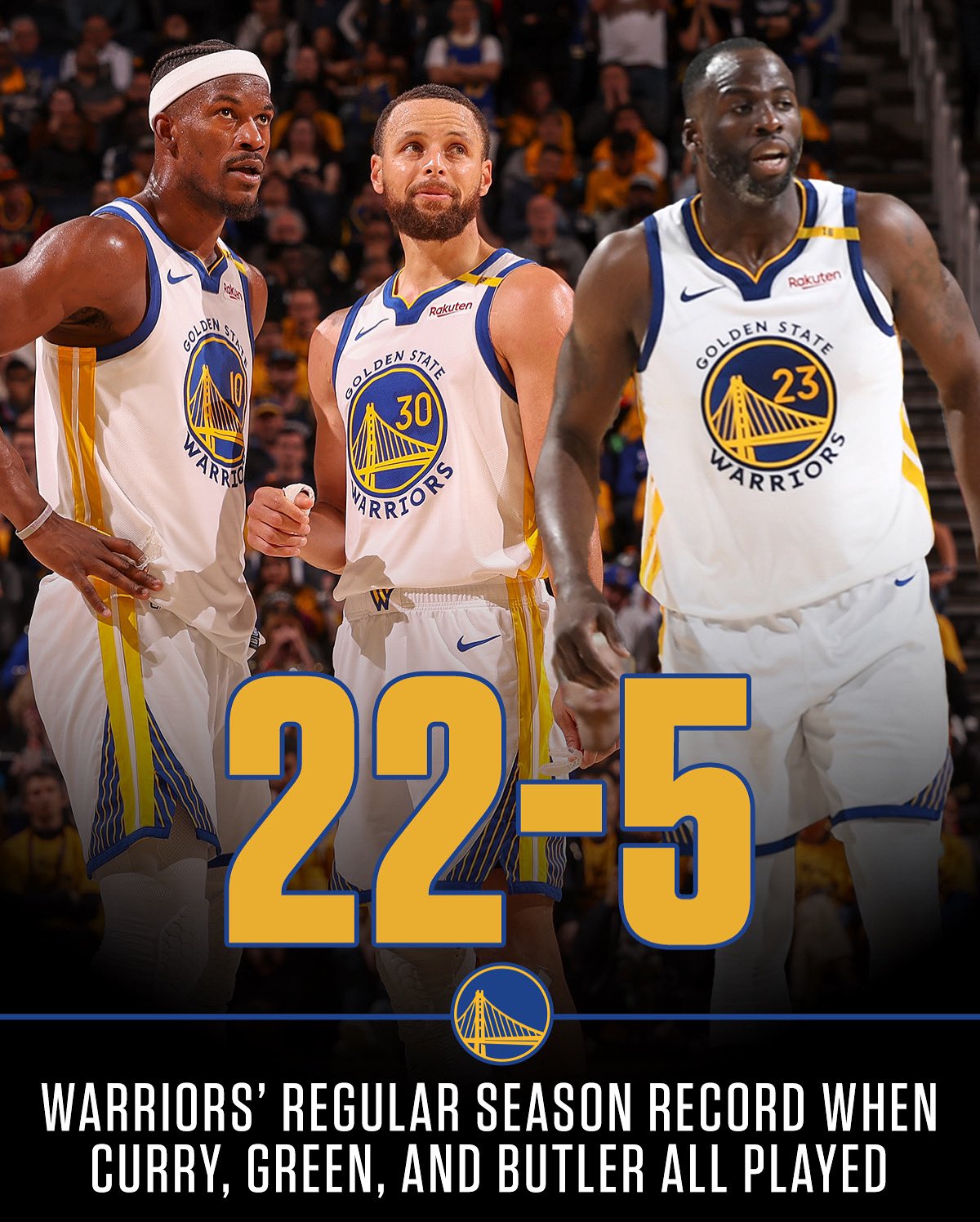 勇士在斯蒂芬-库里、德雷蒙德-格林以及吉米-巴特勒同时出战的情况下,常规赛取得22胜5负的战绩。