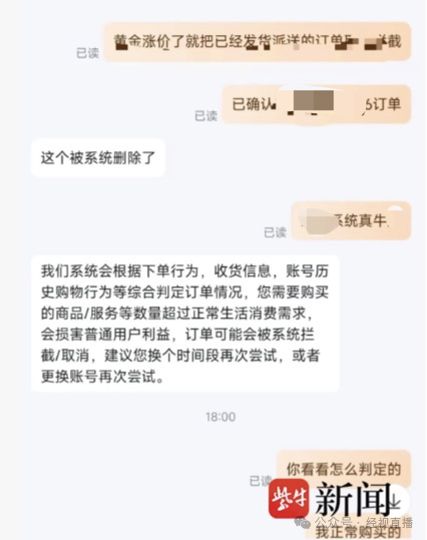 “我首先联系了商家客服,商家回应称自己没有权限取消订单,需联系平台的客服问下情况。”郑先生说,他随即去咨询了平台客服,对方表示郑先生的订单“被系统拦截了”,并告知郑先生:系统会根据下单行为、收货信息、账号、购物历史行为综合判定订单情况,若需要购买的商品/服务等数量超过正常生活消费需求,会损害普通用户利益,订单可能会被系统拦截/取消。客服建议郑先生换个时间段或更换账号再次尝试。郑先生表示,他是正常下单,只是在下单后将地址从北京改到深圳。
